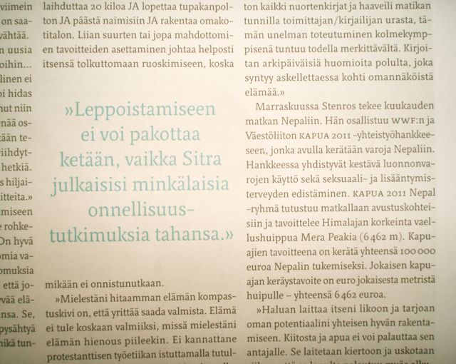 Huomaan kuinka nyt tuntuu paremmalta puhua julkisesti omista tekemisistään. Sen tuntee nahoissaan todella konkreettisesti. Mikä helpotus, minun ei tarvitse enää punnita jokaista lausettani ja koittaa kontrolloida “imagoani” tai rakentaa henkilöbrändiä taikka vetää esimerkillistä nuorisoidolin roolia. Ei ole tarpeen edustaa mitään ideologiaa, televisio-ohjelmaa, duunia tai agendaa. Leipäni ei ole riippuvainen siitä, tykätäänkö minusta, tarjotaanko minulle työtä tai mitä minusta ajatellaan. On aika nastaa jutustella toimittajien kanssa vaan elämästä ja omista ajatuksista. Hassua, aivan kuin riittäisinkin ihan vaan tällaisena kuin olen.