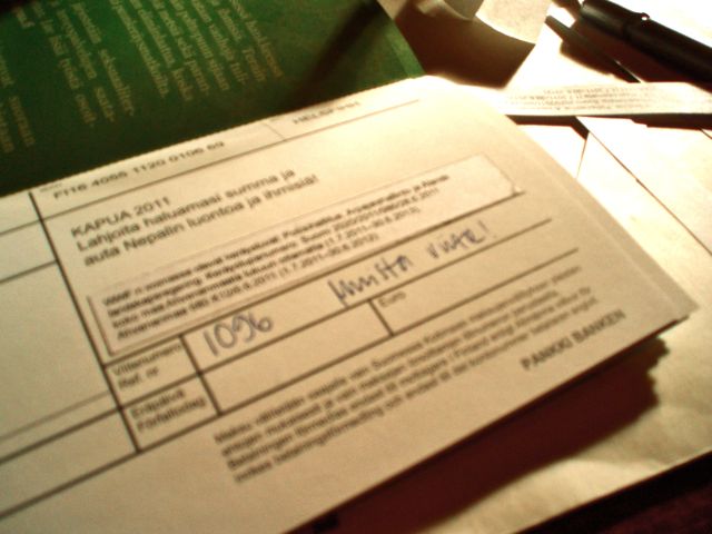 Leikkaa-liimaa-askaretele. Viitteet ja keräysluvat pitää liimata jokaiseen tilisiirtoon erikseen.