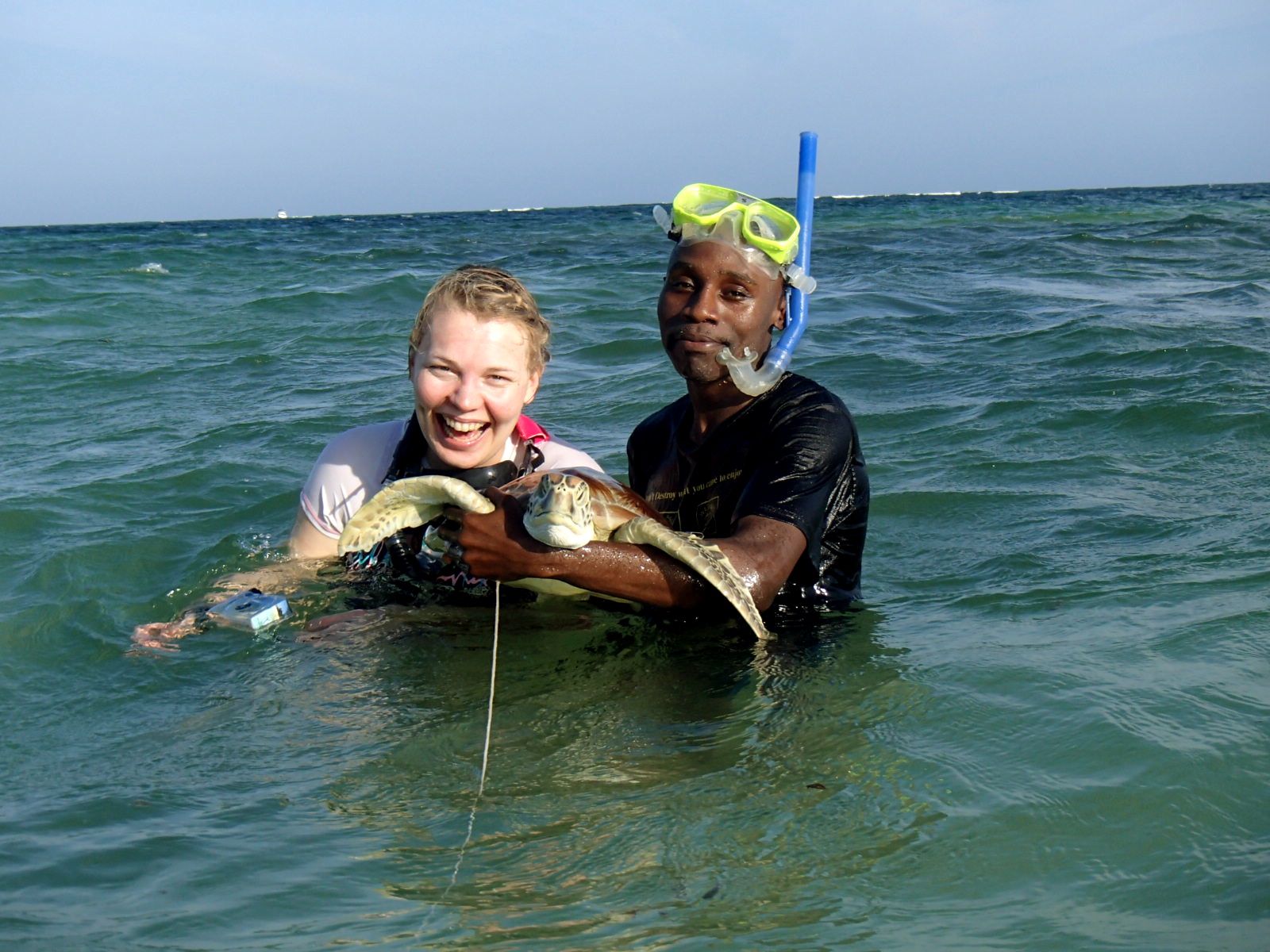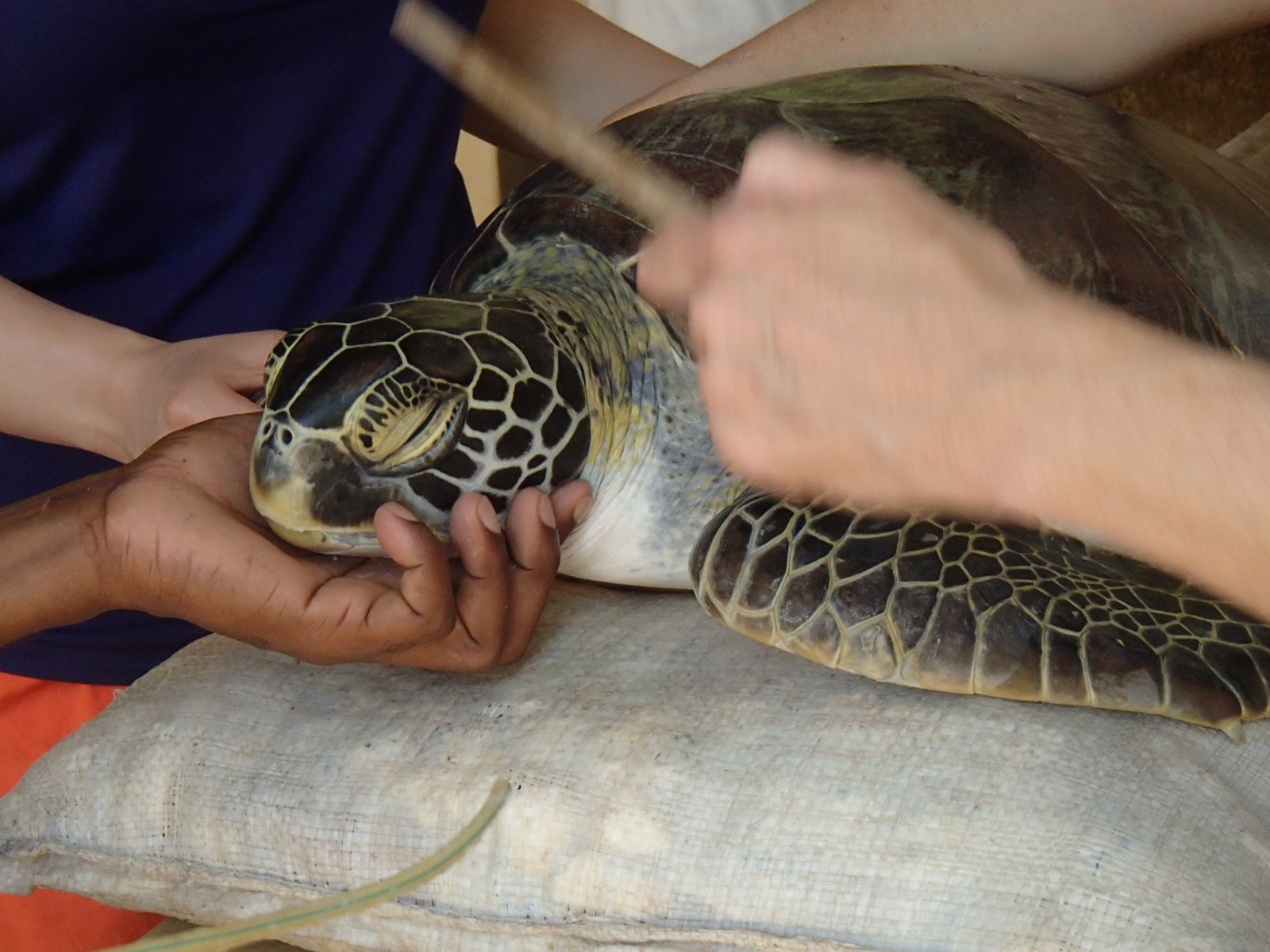 Turtle Watch -suojelujärjestöllä oli useita yhtäaikaisia projekteja meneillään, mutta yksi niistä on haavoittuneita ja sairaita konnia hoitava klinikka. Lasaretin altaiden hoivatit pääsivät säännöllisesti myös mereen polskimaan ”suolakylpyyn”, jonka tarkoitus oli vahvistaa paikallaan kyhjöttäneiden merikilpureiden lihaksia. Samalla suojeluprojektin työntekijät katsoivat, onnistuuko hoidokeilta säännöllinen ilmanotto pinnalta, pääsevätkö kilpurit tarpeeksi nopeasti pakkoon ja maistuuko meriheinä. Olimme tulleet rannalle uimaan klinikalla hoidetun Beauty-kilpikonnan kanssa. Kaunis merikilpikonna oli tervehtynyt täydellisesti ja se vapautettaisiin seuraavana päivänä. Nousimme iloisen riehakkaina vedestä rannalle.